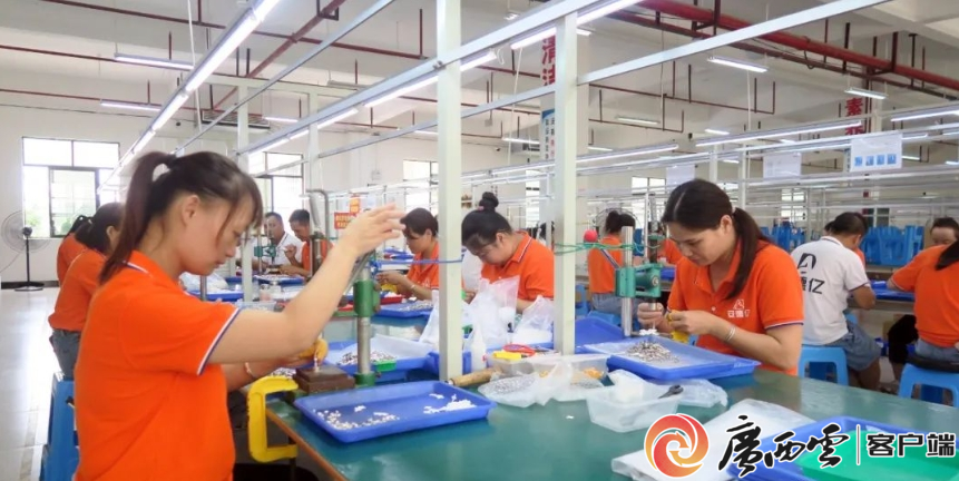 ▲在位于百色市田阳区易地搬迁安置点老乡家园的粤桂协作就业帮扶车间,工人们在生产电子配件。