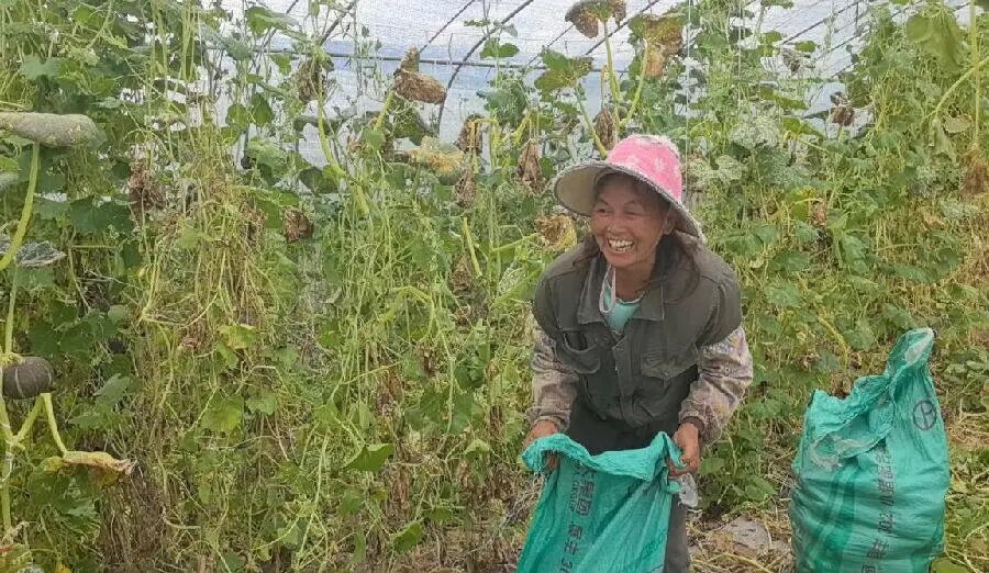 图为村民正在在妙镇现代化农业基地的种植大棚内采摘南瓜(韦玲 摄)