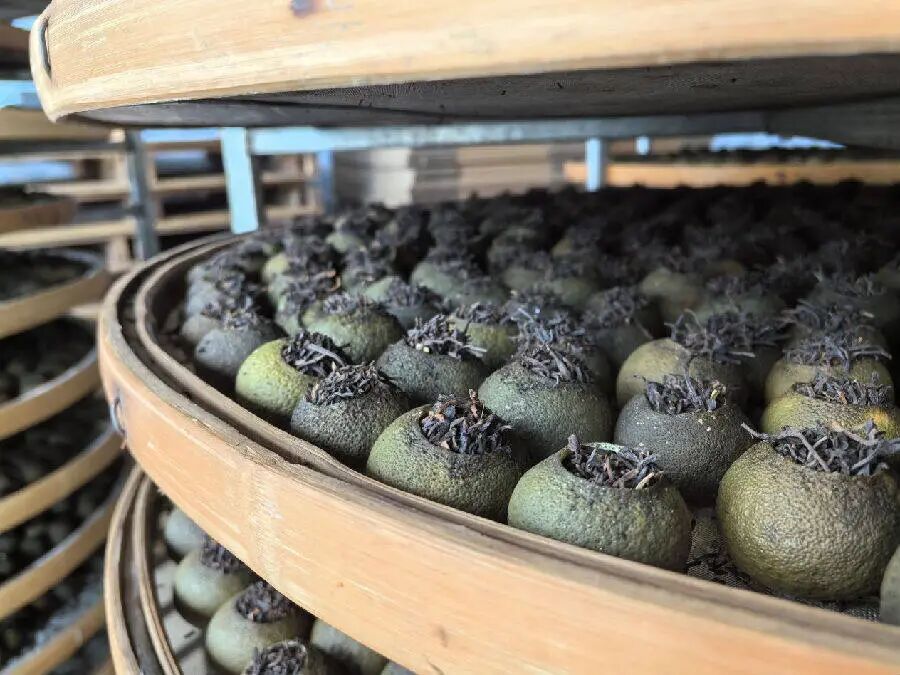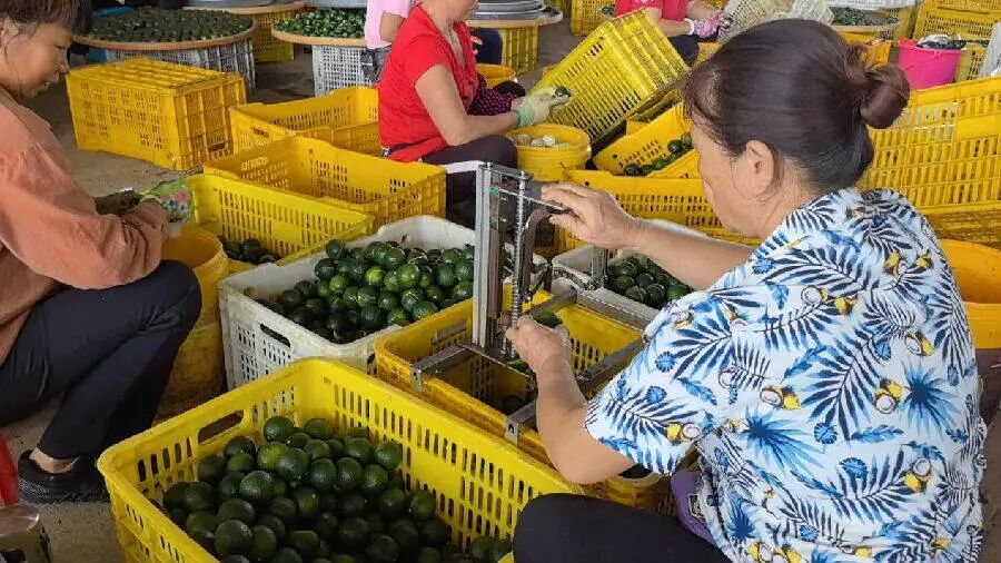 防城港东兴市马路镇柑橘加工现场一派繁忙的景象,工人们正在对采收回来的小青柑进行加工处理。(韦玲 摄)