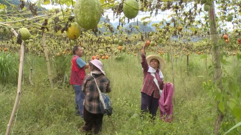驻村工作队员陆霖说:“为实现村民们增收,我们产业园优先聘请附近的脱贫户和农户,针对低收入群体,每当农忙的时候,我们就一一给他们打电话、入户,动员他们到产业园务工,让他们在村里就能挣到补贴家用的钱,同时鼓励、带动他们进行种植,为他们提供种子和技术指导,我们也会在收果的时候帮忙采收。”